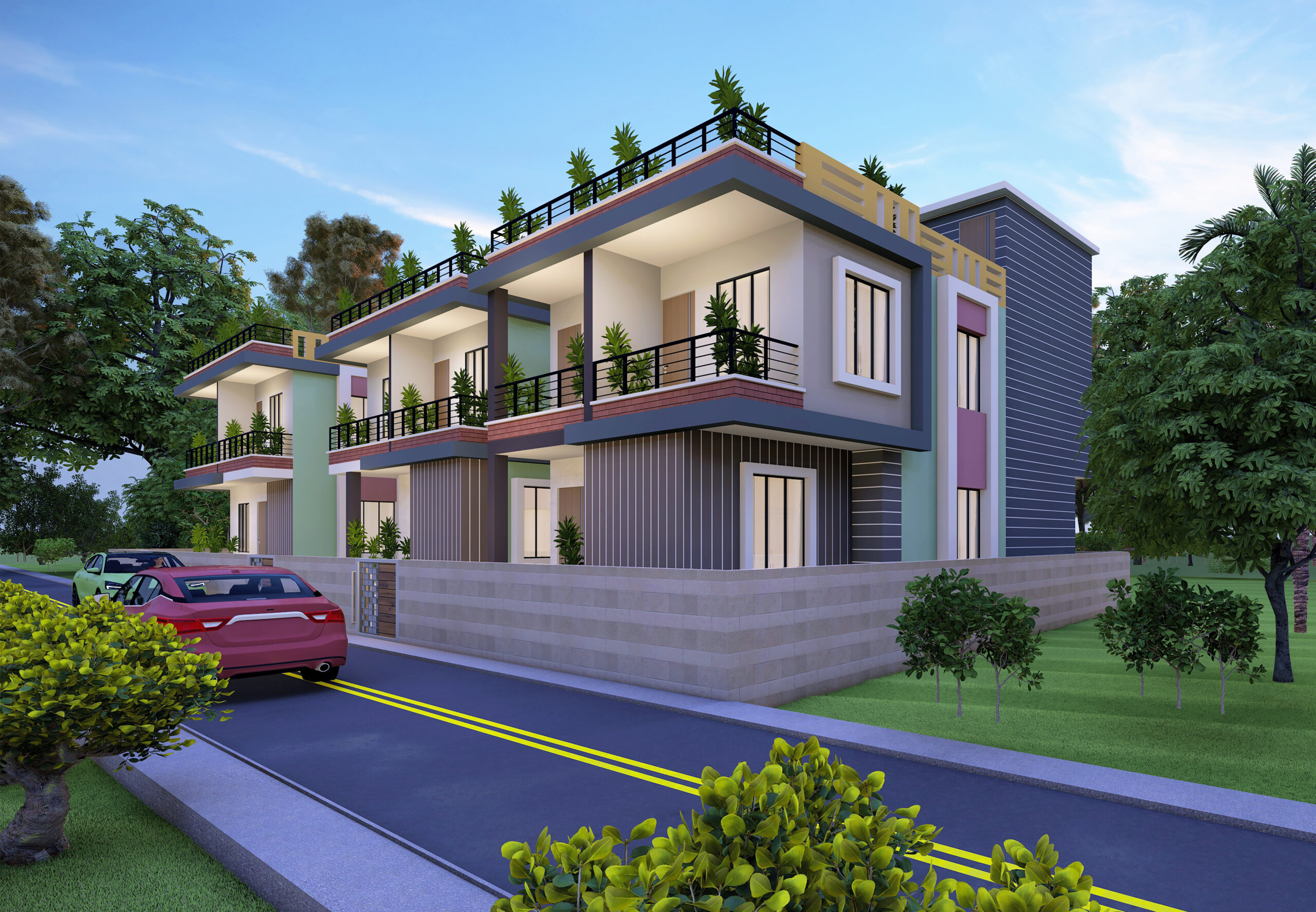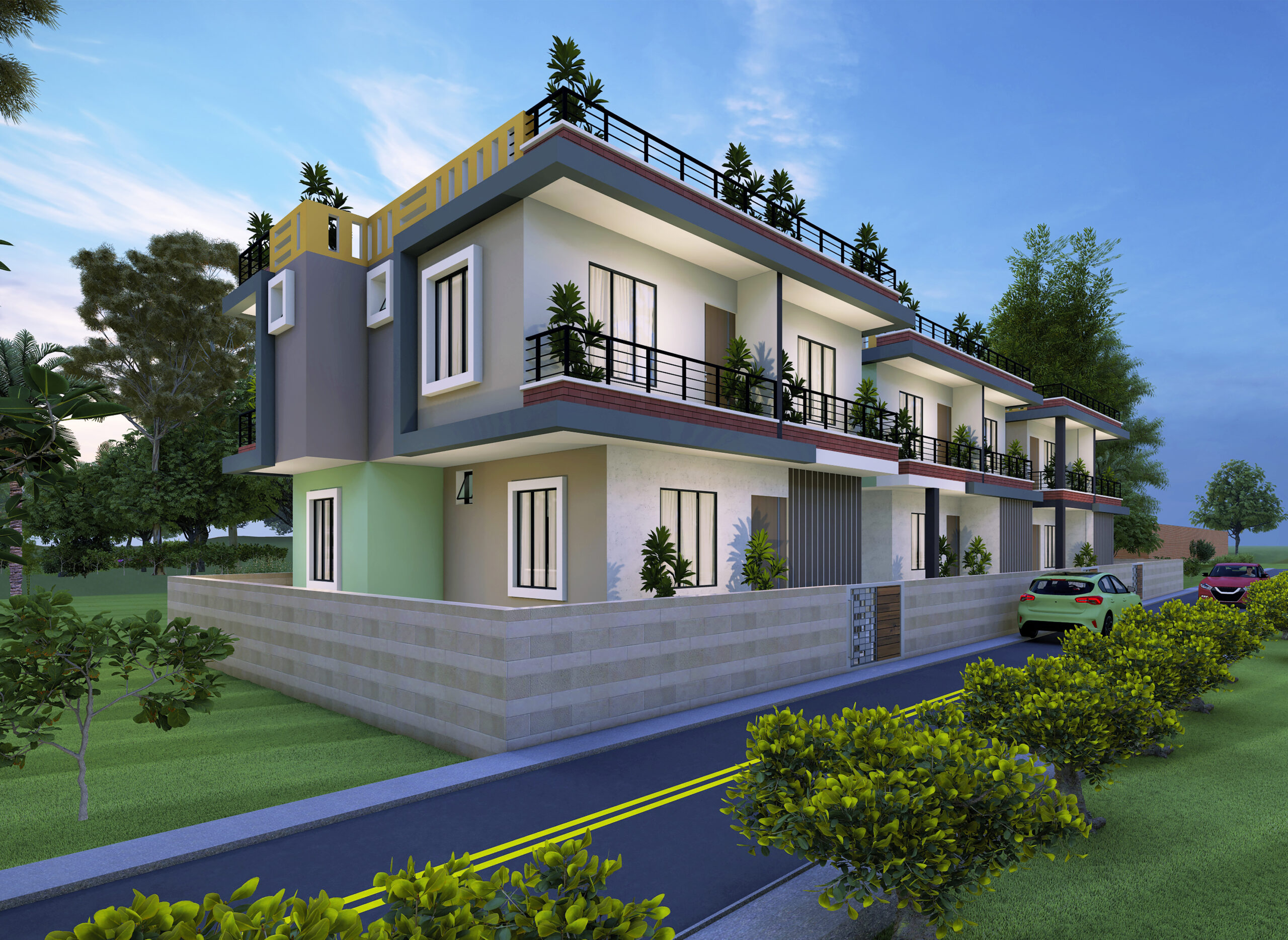 ● Concrete flooring or pavers. ● Gated community entrance ● Open car parking for each duplex
